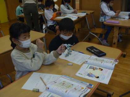 好きな楽器を選んで友達と楽器でお話しました。子供たちは、「楽しくお話したいから、タンブリンを選んで軽く叩いて音を出すことにしたよ」「『おはよう』と挨拶したいから、カスタネットで『タンタンタン』というリズムを叩くことにしたよ」とお話ししたいことを考えながら楽器でリズムをとっていました。