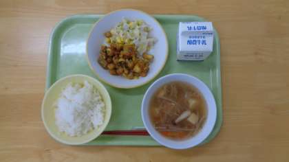 今日の献立は、ご飯、牛乳、魚と豆のカレー揚げ、れんこんサラダ、とうふスープです。
