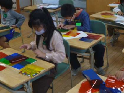 透明な紙を重ねて、いろいろな色や形を見付けました。子供たちは、「色を重ねると紫やオレンジ、金色に見えたよ」「少しずつずらして重ねると、虹色の海に海草が揺れている感じがするよ」など、楽しい見え方を見付けて、友達に話していました。