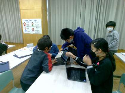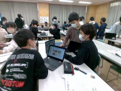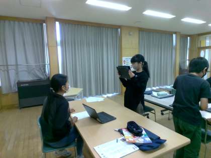 外国語科では、食べたものや食べたものの産地を紹介する活動をしています。自分たちの発音が正しいか表現がうまくできているかを動画に撮り、アドバイスしあいました。