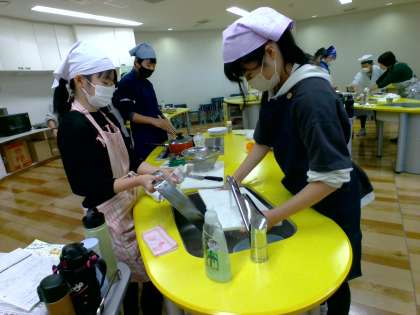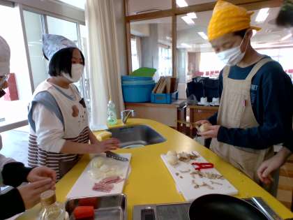 家庭科では、野菜スープとベーコンポテトをつくりました。班の友達と協力して工程を意識して活動しました。