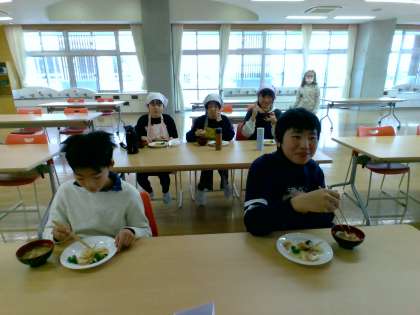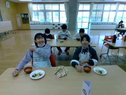 家庭科では、野菜スープとベーコンポテトをつくりました。班の友達と協力して工程を意識して活動しました。