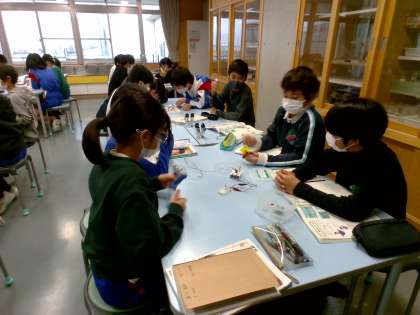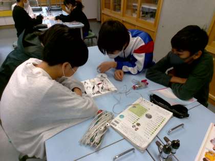 手回し発電機を用いて電気をつくりました。そして、モーターや電子オルゴール等の器具につないで電気を利用してみました。