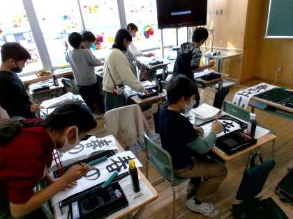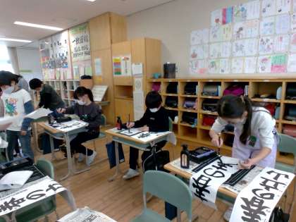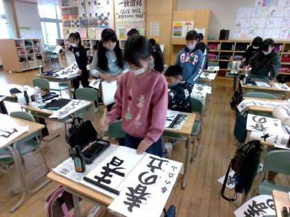 今日から書き初めの練習を始めました。文字の大きさや配列に気を付け、「春の立山」を一生懸命に書きました。