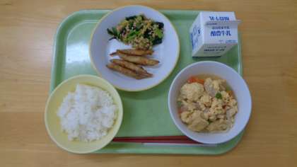 今日の献立は、ご飯、牛乳、きびなごの唐揚げ、納豆和え、親子煮です。