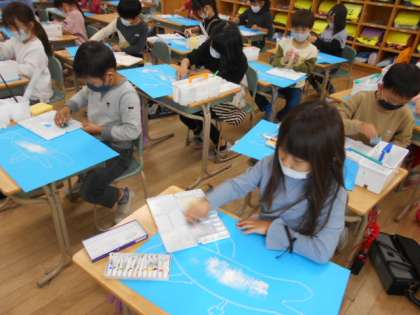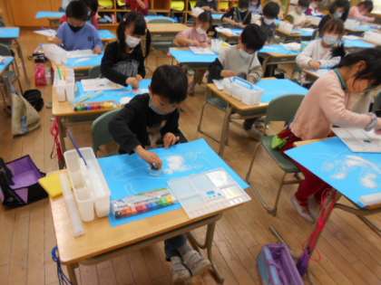 子供たちが大好きなお話「くじらぐも」の絵を描きました。青空に見立てた真っ青の画用紙に、白色の絵の具をスポンジに付けてポンポンッと色づけしていきました。「本当の雲みたい!」「楽しい!」と子供たちは大喜び。次の時間には、出来上がったくじらぐもに子供たちを描き、もっと素敵な絵にしていきたいと思っています。