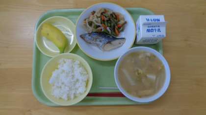 今日の献立は、ご飯、牛乳、鰆の塩焼き、茎わかめのきんぴら、具だくさん汁、バナナです。