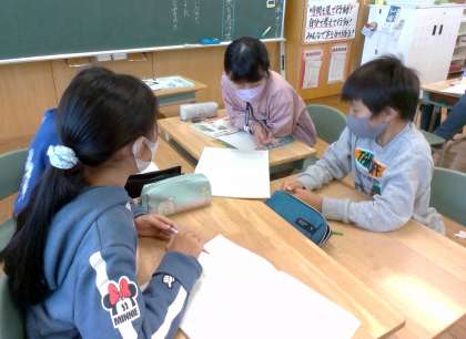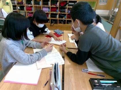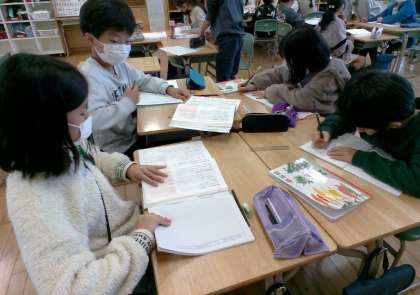 日々の生活の中で、不思議に思ったことや嬉しかったこと、聞いたり見たりしたこと等を詩に表しました。今日は互いの詩を読み合って、どんな書き方の工夫があるかを見付け、感想を伝え合いました。