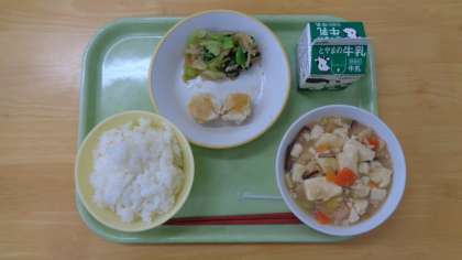 今日の献立は、ご飯、牛乳、にんじんシューマイ、大根ナムル、エビと豆腐のうま煮です。