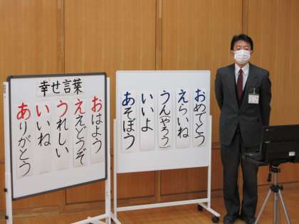 校長先生からは、幸せ言葉を引き続き大切にしてほしいというお話を聴き、「かきくけこ」の幸せ言葉を考えてほしいという宿題が出されました。