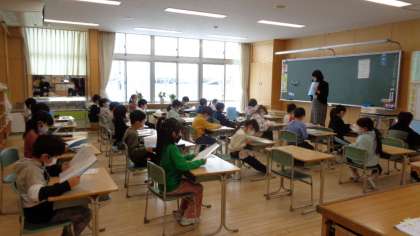 校長先生から幸せ言葉のお話があり、子供たちは静かに耳を傾けて聞いていました。