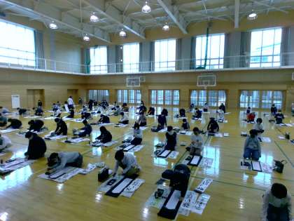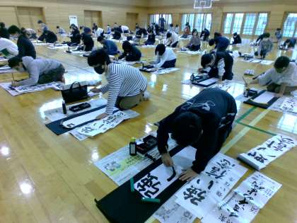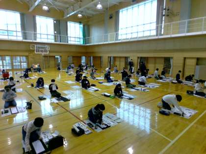 6年生はアリーナにて学年で書き初め大会を行いました。2学期の書写の時間や冬休み中の練習の成果を出すことができるよう、集中して「強い信念」という文字を書きました。