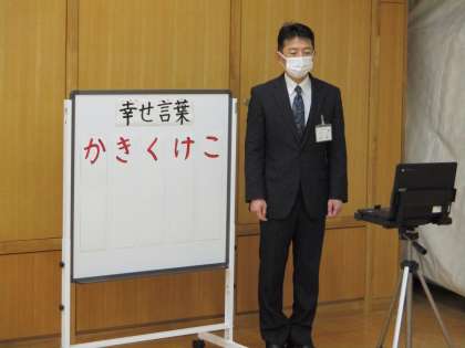 校長先生からは、今年の干支のうさぎのように飛躍の一年にしてほしいという話があり、「『かきくけこ』の幸せ言葉」を考える宿題の提出を楽しみにしているとメッセージを送りました。