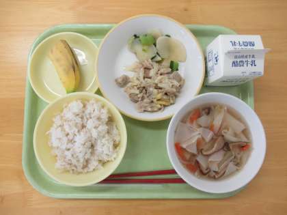 今日の献立は、麦ご飯、牛乳、塩だれ豚丼、かぶのいろどり、ワンタンスープ、バナナです。