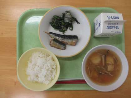 今日の献立は、ご飯、牛乳、いわしの梅煮、よごし、すいとんです。