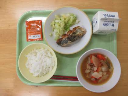 今日の献立は、ご飯、牛乳、魚のえごまだれ、茹でキャベツ、大根と豚肉の煮込み、穀物ふりかけです。