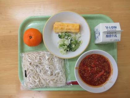 今日の献立は、ソフト麺、牛乳、ソフト麺ミートソース、卵ロール、グリーンサラダ、みかんです。