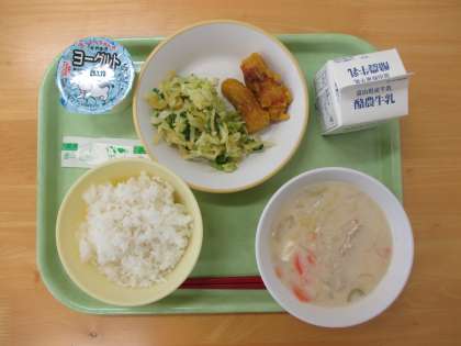 今日の献立は、ご飯、牛乳、ちくわのカレー揚げ、あわせ和え、豆乳汁、ヨーグルトです。