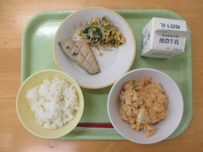今日の献立は、ご飯、牛乳、さわらの西京焼き、コーン和え、厚揚げの錦とじです。
