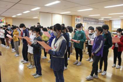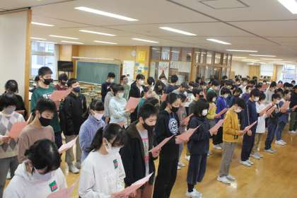 学年朝の会では、卒業式で歌う曲「今、卒業の時!」の合唱練習を行っています。