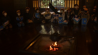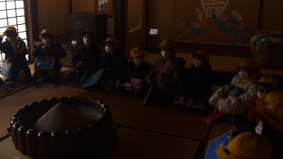 民芸合掌館では、合掌造りの特徴やいろりのよさを教えていただきました。子供たちはいろりを囲んで、和やかな気持ちでお話を聞いていました。