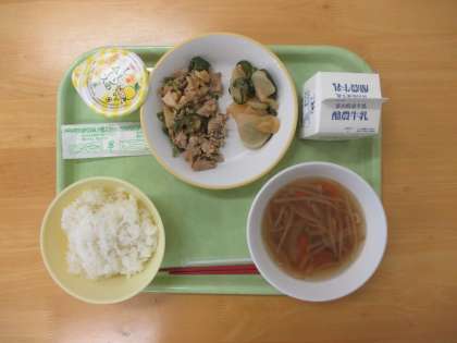 今日の献立は、ご飯、牛乳、ピーマンマンの炒め物、かぶの中華和え、春雨スープ、レモンムースです。今週は学校給食週間のメニューです。「本の世界を味わおう 〜読んでおいしい、食べておいしいお話〜」というテーマで、本に登場する料理や食材を取り入れ、その本にちなんだ献立を実施します。今日は「ピーマンと夜ふかし大まおう」の絵本から、主人公のピーマンマンをイメージした炒め物と、仲間のレモンを素材にしたデザート「レモンムース」を味わいました。