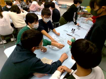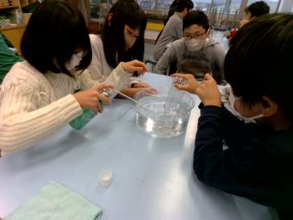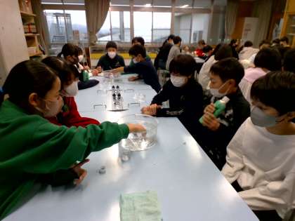 二酸化炭素は、水に溶けるかを調べました。水と二酸化炭素を入れたペットボトルをふると、ペットボトルがへこみ驚いた様子の子供たちでした。また、石灰水をまぜ反応の変化を観察しました。