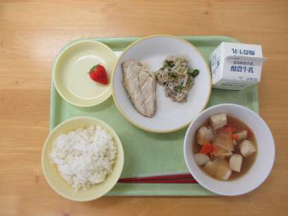 給食週間3日目は、物語「男子☆弁当部」シリーズの世界を味わっています。献立は、ご飯、牛乳、鯖の塩焼き、えのきの梅肉和え、のっぺい、いちごです。「えのきの梅肉和え」は、主人公ソラが物語中で作った朝ごはんのメニューです。また、「のっぺい」は、米作りをしているカンさんがみんなで食べるために大きな鍋で作った料理です。