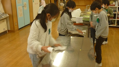 配膳台の汚れを拭いたり、落ちているぞうきんを見付けてきれいにたたんでかけたりしていました。自分から進んで行動する姿が素敵でした。
