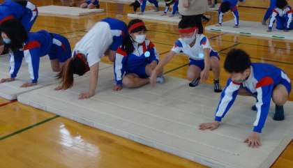 体育科の学習では、マット運動をしています。今日は体をほぐし、前転や後転、壁倒立に取り組みました。