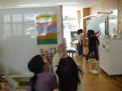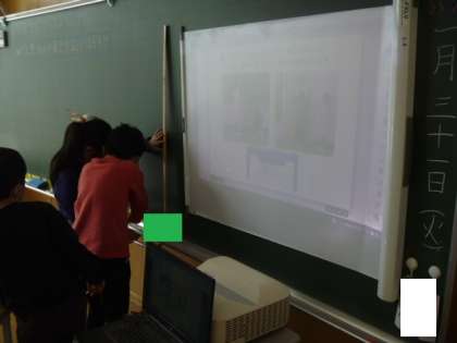 子供たちは「机の横の長さが1mだと予想したけど、20cm違っていた」「スクリーンの横の長さが1mだった。予想と同じだった」など、1mのものを探しながら1mの感覚をつかんでいった様子でした。
