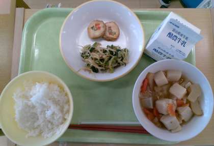 今日の献立は、ご飯、牛乳、野菜の肉巻き、おひたし、おでんです。
