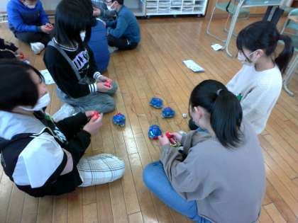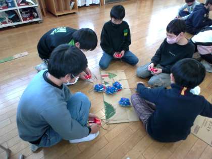 理科「電流が生み出す力」では、電磁石の性質を使って、サッカーロボを作りました。「強くするためには、電池を増やしたらいいんじゃない?」「二人分の電池をつなげてみる?」等と話し合いながら実験していました。