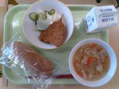 今日の献立は、黒糖コッペパン、牛乳、アジフライ、かぶのサラダ、マカロニスープです。