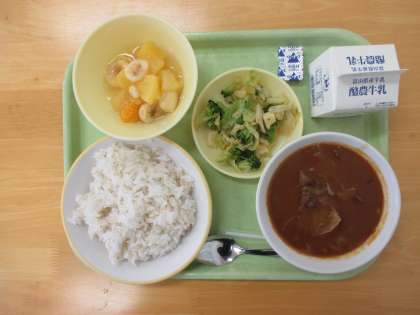 今日の献立は、麦ご飯、牛乳、ビーフストロガノフ、グリーンサラダ、フルーツミックス、ポケットチーズです。