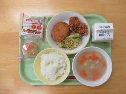 今日は選択献立の日です。主菜を「豚肉の竜田揚げ」「肉じゃがコロッケ」から一つ、デザートを「メープルマフィン」「いちごのシュークリーム」から一つ、事前に選んであります。その他のメニューは、ご飯、牛乳、味噌汁、あわせ和えです。選ぶ楽しさと珍しいメニューを味わえる喜びで、思わず笑顔になる子供たちでした。