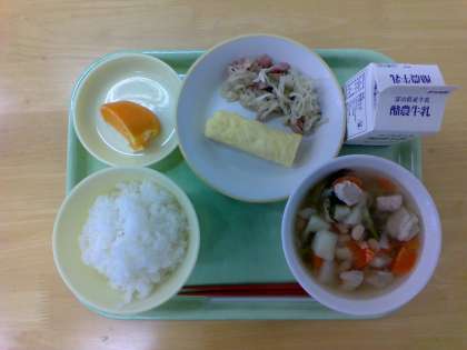 今日の献立は、ご飯、牛乳、卵ロール、はりはりソテー、野菜のスープ煮、甘平です。