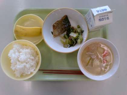 今日の献立は、ご飯、牛乳、アジのみりん焼き、チンゲンサイソテー、豚汁、バナナです。