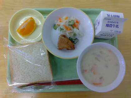 今日の献立は、食パン、牛乳、鶏肉のトマトソース味、大根サラダ、米粉シチュー、デコポンです。