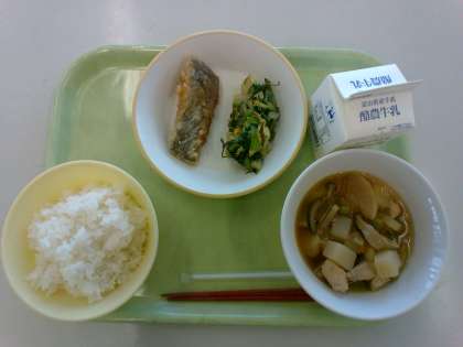 今日の献立は、ご飯、牛乳、揚げ魚のレモン味、昆布あえ、やまと煮です。