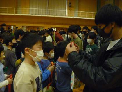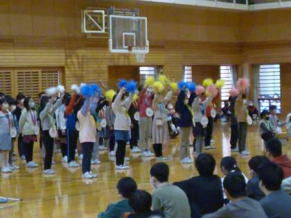 2年生は、卒業を祝う集会で6年生への感謝の気持ちをエールとメッセージメダルで伝えました。