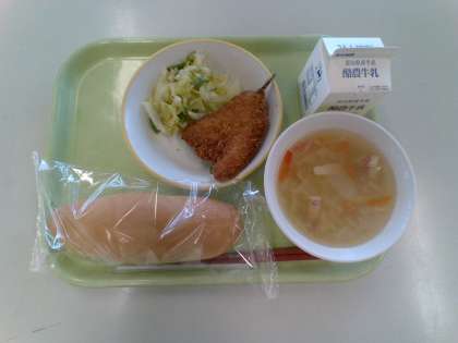 今日の献立は、コッペパン、牛乳、あじフライ、アスパラサラダ、ポテトスープです。