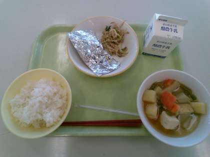 今日の献立は、ご飯、牛乳、さばの銀紙焼き、ごまびたし、関東炊きです。