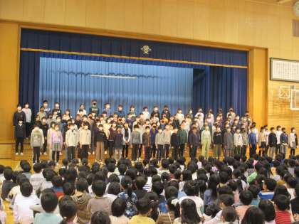 6年生が「卒業を祝う会」のお返しに、卒業式で歌う「今、卒業の時!」を心を込めて歌いました。在校生は真剣に耳を傾け、残り少ない6年生との時間を一緒に楽しく過ごそうと思っているようでした。