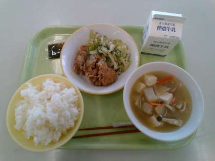 今日の献立は、ご飯、牛乳、鶏肉の竜田揚げ、ゆかり和え、けんちん汁、のり佃煮です。