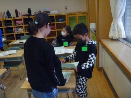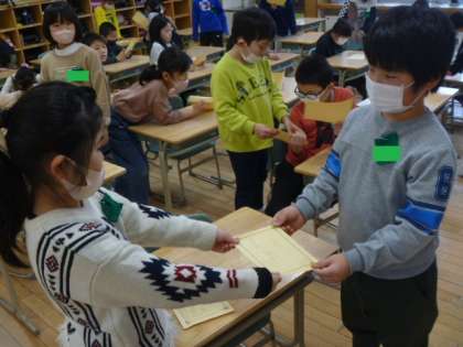 友達から手紙をもらいました。子供たちは友達からの手紙を何回も読み、返事を書きました。学習を振り返って「友達の手紙を読んで、自分のよさが分かった」「これからも、友達の素敵なところを見付けたら手紙を書きたいな」などの感想をもちました。