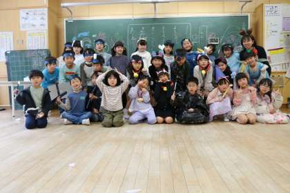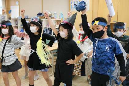 クラス集会のメインは「仮装ダンス」。魔女、妖精、動物、海賊などに変身し、みんなでダンスをしました。なりきって踊っている子供たちはみんないい表情をしていました。