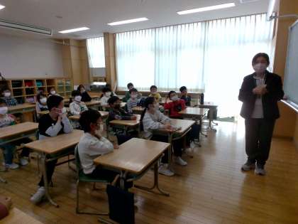 3年生初めての外国語の授業がありました。ALTの先生の発音のマネをしたり、好きな色を互いに聞いたりしました。