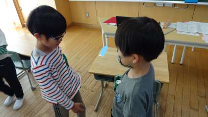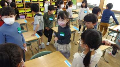 今日から学校での生活が始まりました。各学級で挨拶や返事の仕方、下足入れの使い方等を学習しました。学級の友達と挨拶をして握手をするゲームに取り組みました。目を繋いで丁寧に挨拶する様子が見られました。明日からも進んで気持ちよく挨拶ができるといいですね。