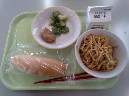 コッペパン(減)、牛乳、テリヤキチキン、えごまドレッシングサラダ、やきそば